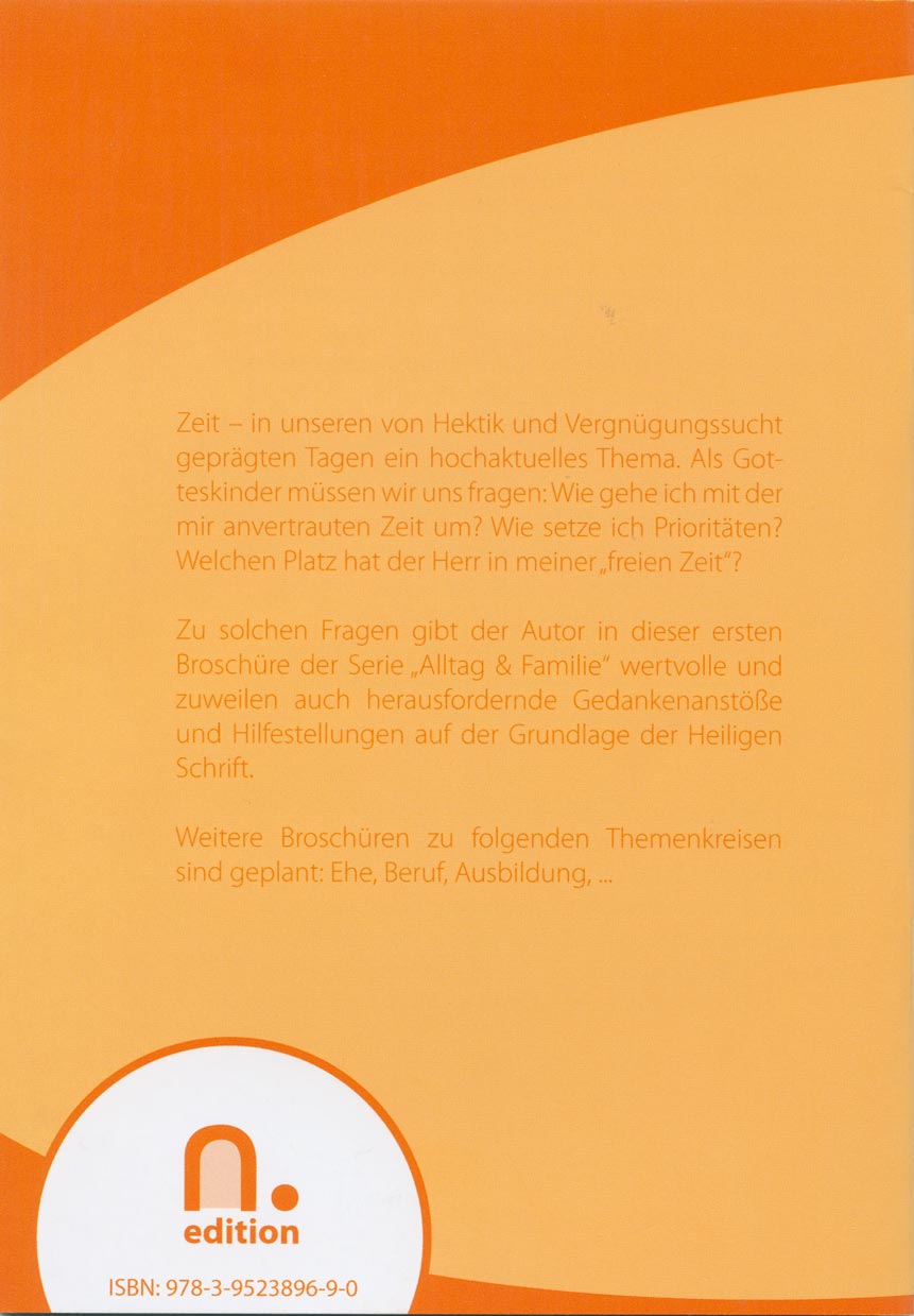 Zeit – in unseren von Hektik und Vergnügungssucht geprägten Tagen ein hochaktuelles Thema. Als Gotteskinder müssen wir uns fragen: Wie gehe ich mit der mir anvertrauten Zeit um? Wie setze ich Prioritäten? Welchen Platz hat der Herr in meiner„freien Zeit“?