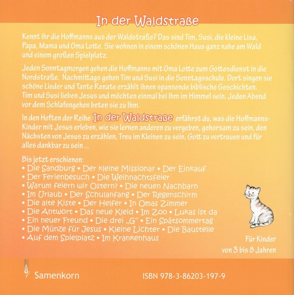 In den Heften der Reihe „In der Waldstraße“ erfährst du, was die Hoffmanns-Kinder mit Jesus erleben, wie sie lernen anderen zu vergeben, den Nächsten von Jesus zu erzählen, Treu im Kleinen zu sein, Gott zu vertrauen und für alles dankbar zu sein.Thema: Susi kommt ins Krankenhaus
