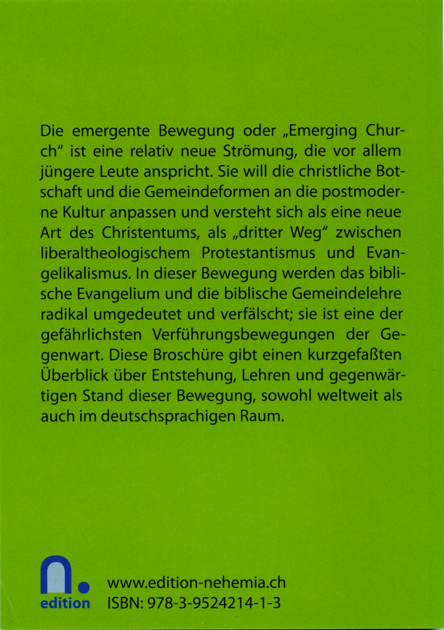 Die emergente Bewegung oder „Emerging Church“ ist eine relativ neue Strömung, die vor allem jüngere Leute anspricht. Sie will die christliche Botschaft und die Gemeindeformen an die postmoderne Kultur anpassen und versteht sich als eine neue Art des Christentums, als „dritter Weg“ zwischen liberaltheologischem Protestantismus und Evangelikalismus. In dieser Bewegung werden das biblische Evangelium und die biblische Gemeindelehre radikal umgedeutet und verfälscht; sie ist eine der gefährlichsten Verführungsbewegungen der Gegenwart. Diese Broschüre gibt einen kurzgefaßten Überblick über Entstehung, Lehren und gegenwärtigen Stand dieser Bewegung, sowohl weltweit als auch im deutschsprachigen Raum.