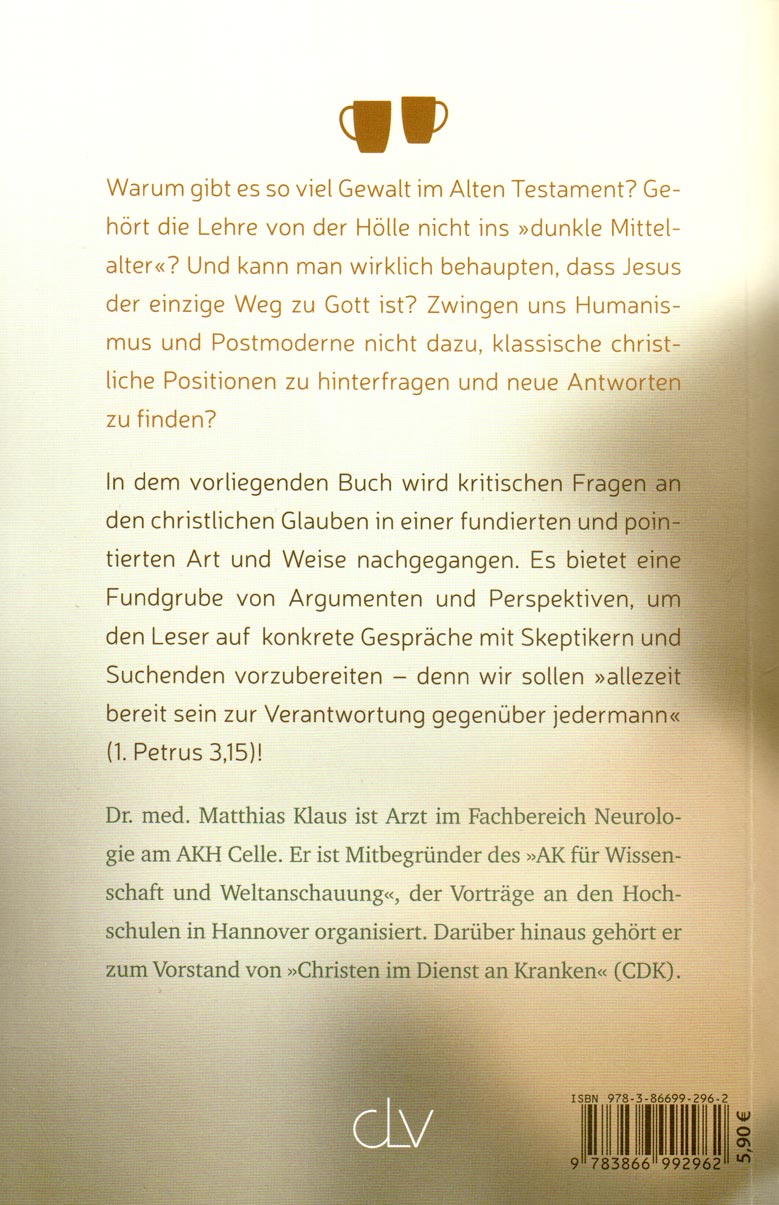 In dem vorliegenden Buch wird kritischen Fragen an den christlichen Glauben in einer fundierten und pointierten Art und Weise nachgegangen. Es bietet eine Fundgrube von Argumenten und Perspektiven, um den Leser auf konkrete Gespräche mit Skeptikern und Suchenden vorzubereiten – denn wir sollen „allezeit bereit sein zur Verantwortung gegenüber jedermann“ (1. Petrus 3,15)!