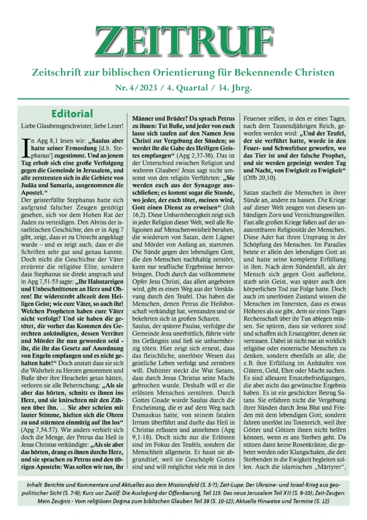 Der „Zeitruf“ hat sich zum Ziel gesetzt, die Gemeinde Jesu durch biblische Ausarbeitungen und Informationen zuzurüsten und aufzuklären. Neben der Auslegung der Offenbarung veröffentlichen wir aktuelle Nachrichten und Themen aus Gemeinde und Gesellschaft, Berichte von Zeitzeugen usw.